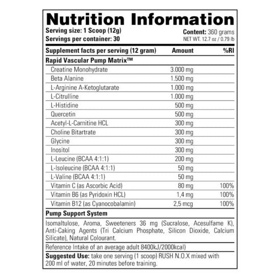 RUSH NOx bevat geen geheimzinnige ingrediëntendeclaratie. Tot op de milligram nauwkeurig kan je op het etiket zien wat je inneemt. Onze RUSH N.O.X. combineert 100% transparantie met 100%  kwaliteit. Ieder schepje van 12 gram levert je 3 gram creatine 1,5 gram beta alanine, 1,5 gram N.O. boosters (arginine, citrulline, histidine), 1 gram BCAA’s en bijna 1 gram aan neurotransmitters en focus ingrediënten.