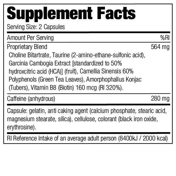 • Each capsule now contains 140 mg caffeine, and is supplemented with a special complex based on choline, taurine, green tea, konjac fiber and hydroxy-citric acid