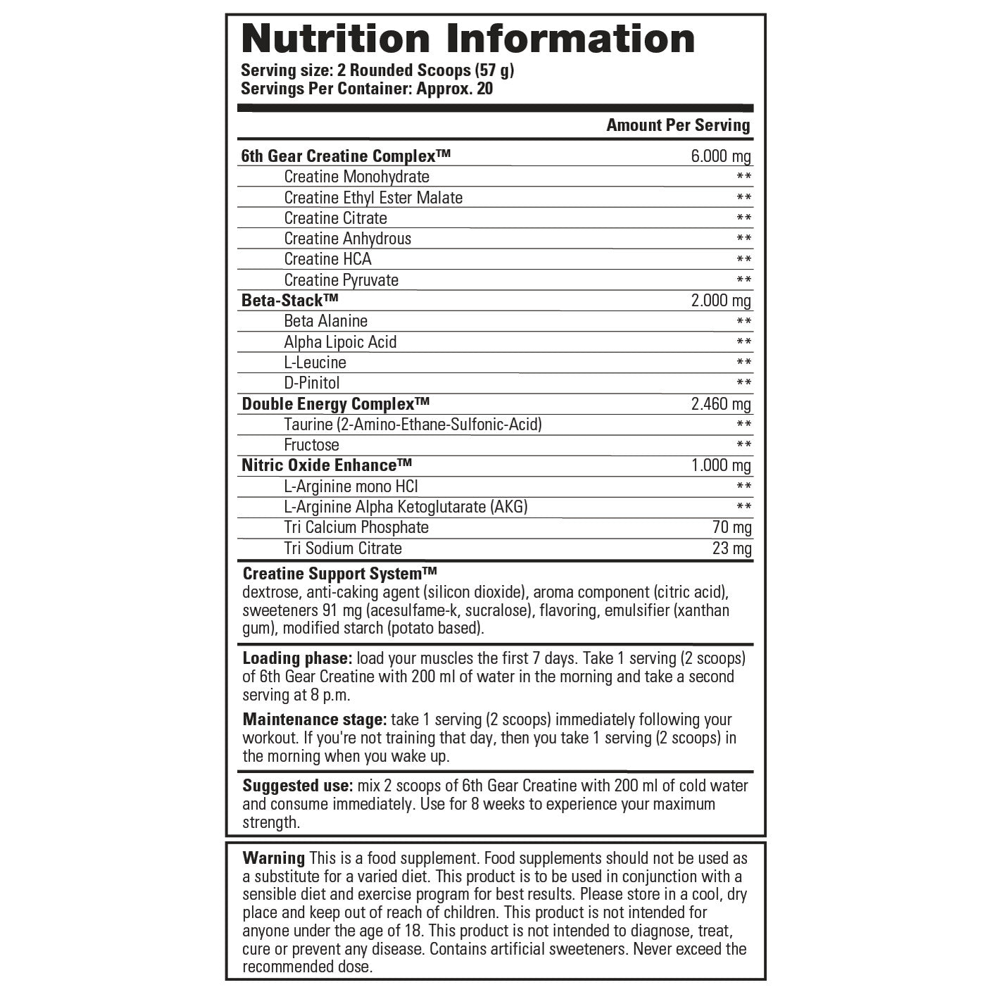 Aangevuld met een farmaceutische versie van beta-alanine zorgt dit voor een flinke carnosinebuffer. Koolhydraten versnellen de algehele absorptie en Alpha liponzuur zorgt voor de noodzakelijke insulinepiek. Zodoende knalt je lichaam de creatine en het glycogeen rechtstreeks in de spiercel. En daardoor bereik je met 6th Gear Creatine Complex zulke waanzinnige resultaten.