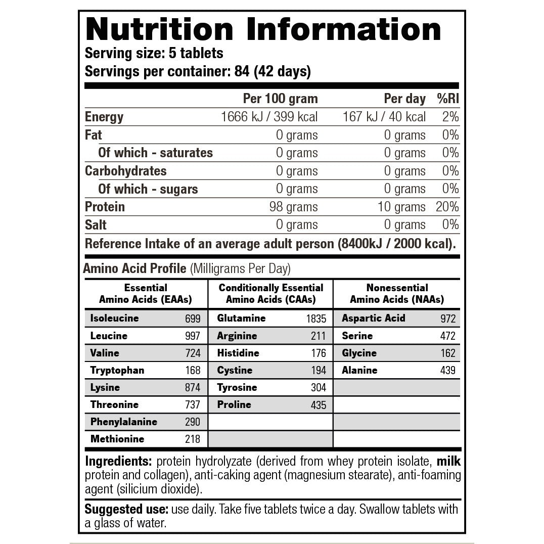 eiwit hydrolisaat (verkregen van whey eiwit isolaat, melk eiwit en collageen), anti-klontermiddel (magnesium stearaat), anti-schuimmiddel (silicium dioxide)